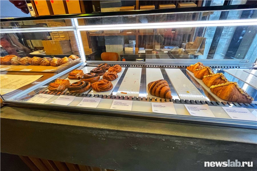 Пекарня «12 слоёв» расположилась в одном их домов ЖК «Притяжение» рядом с «Планетой». Помещение она делит с «Майк и Молли», из-за чего со входа начинается небольшой сумбур. Так как у «Слоёв» нет своих столиков, непонятно, где можно съесть выпечку, если ты не берешь ее навынос.