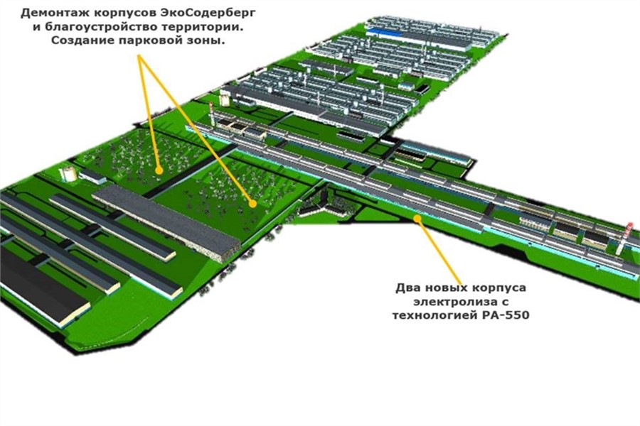 Половину старых корпусов действующего завода заменят на два новые с одновременным внедрением экологичной технологии обоженного анода и электролизеров РА-550 собственной разработки РУСАЛа.