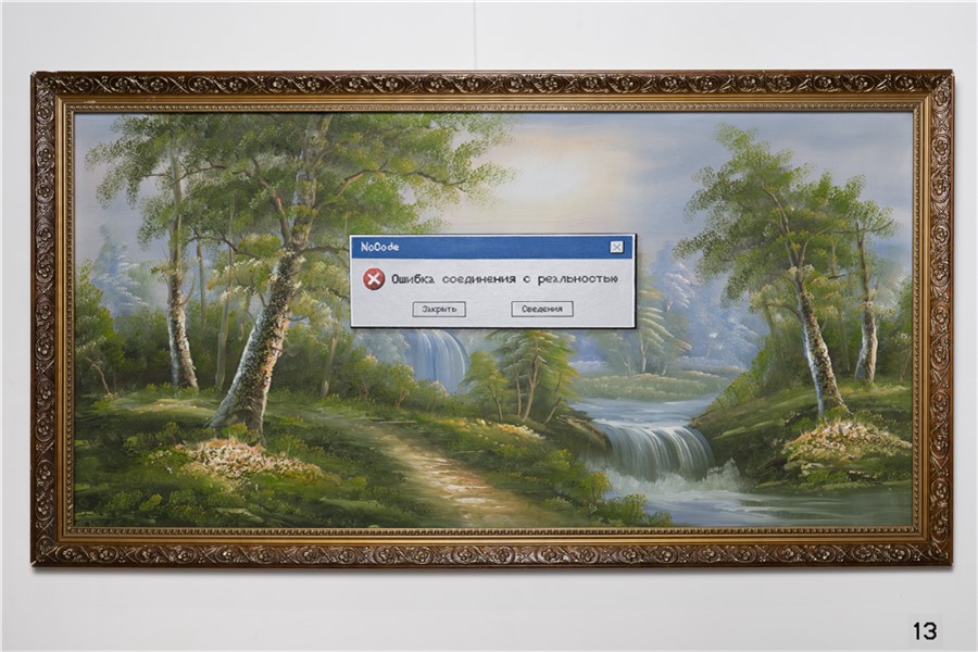 Выставка идет по кругу, имитируя логику бесконечного прокручивания ленты новостей или повторного просмотра одного и того же видео. Финалом становится холст, сгенерированный ИИ.