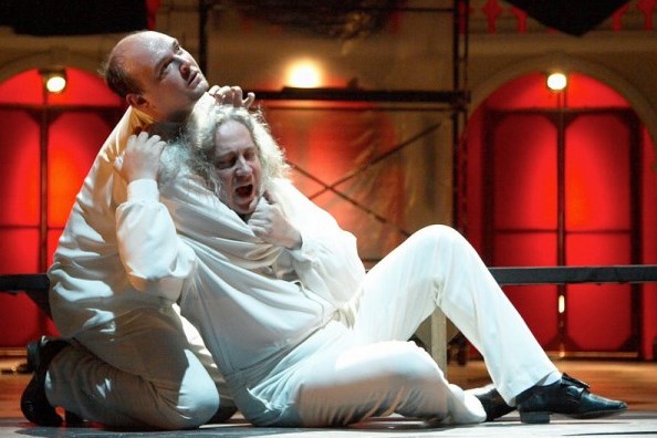 Но главная претензия, которую я могу предъявить этому спектаклю — это отсутствие чувства пространства, которое тот же Феодори в «Наташиной мечте» сумел разве что не дать каждому попробовать на вкус. «Тартюф» похож на грот, украшенный драгоценными камнями и черепами убитых купцов, на пещеру сорока разбойников во время приготовления их к какому-то страшному злодеянию — черное и красное, горы барахла, невнятный свет, изломанные тени, которые постоянно пребывают в движениях-конвульсиях. А на переднем плане — история двух крайне несимпатичных людей, харизматичных, но далеких и непонятных, на которых смотреть нужно не через театральный бинокль, а сквозь волшебные линзы, как в произведении одного американского фантаста.