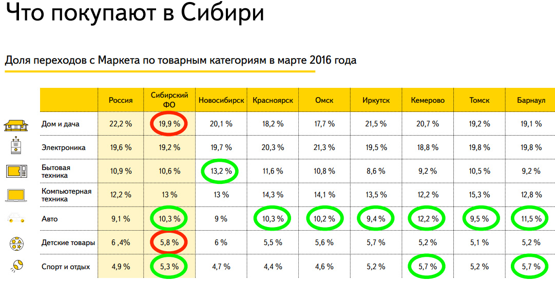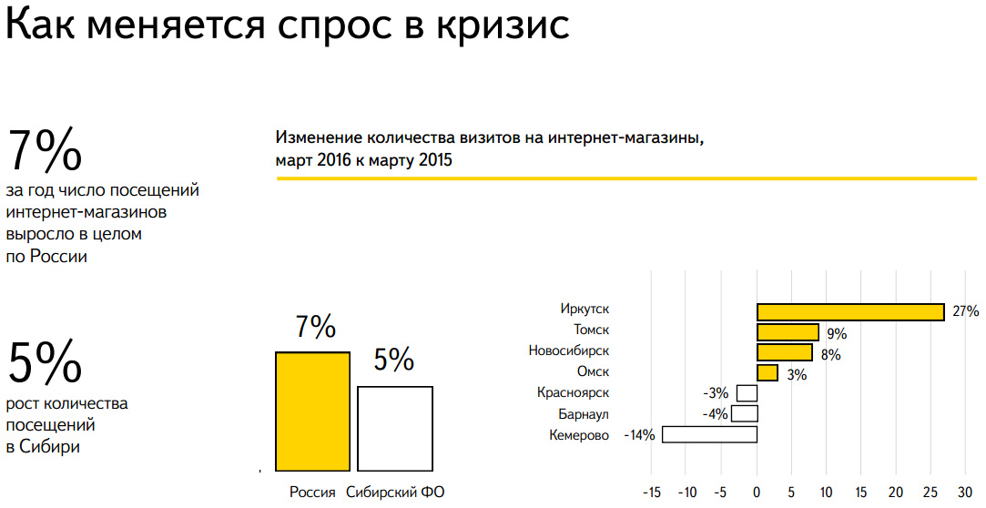 Интерес к Яндекс.Маркету в Красноярске вырос меньше, чем в прочих сибирских городах, включая Новосибирск, — всего на 25%: интернет-шопинг у нас популярен уже давно, а денег крутится больше. Есть и объективное препятствие: электронные продажи завязаны на доступность интернета, и здесь размеры и природные особенности Красноярского края играют против него.