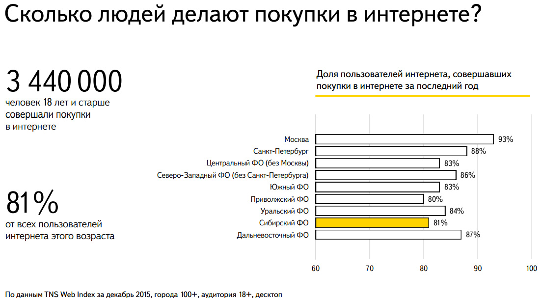 Сибиряки, как и россияне в целом, всё чаще покупают через сеть. По данным TNS, за 2015 год не менее 3,44 млн человек из Сибирского федерального округа приобретали товары онлайн, это 81% от всех пользователей интернета старше 18 лет. Пока это фактически самый низкий показатель по регионам — электронные покупки охотнее совершают не только в столицах, но, например, и на Дальнем Востоке. За год интерес к интернет-шопингу в Сибири вырос на 5%, что немного ниже общероссийских 7%, зато аудитория Яндекс.Маркета увеличилась почти вдвое: ходить через сервис на страницы интернет-магазинов стали на 42% чаще, тогда как в федеральных масштабах этот показатель составил только 34%.