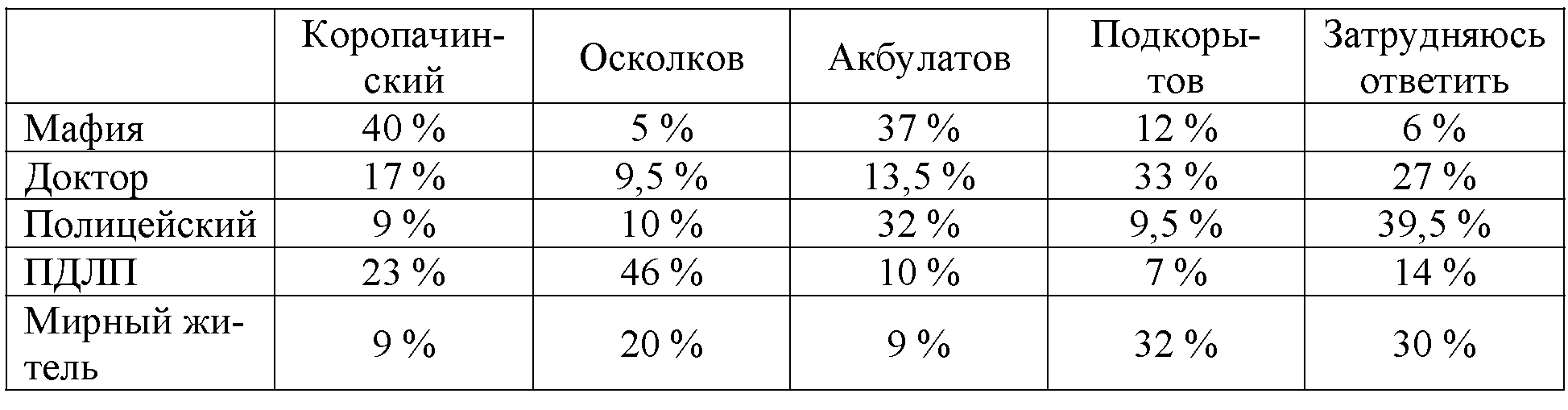 Вот, собственно, опрос и состоял в том, чтобы «расписать» перечисленные выше роли среди кандидатов на должность Главы города. Поскольку таблицы представляют собой почти непреодолимую трудность при форматировании для интернета, постольку покажем её рисунком