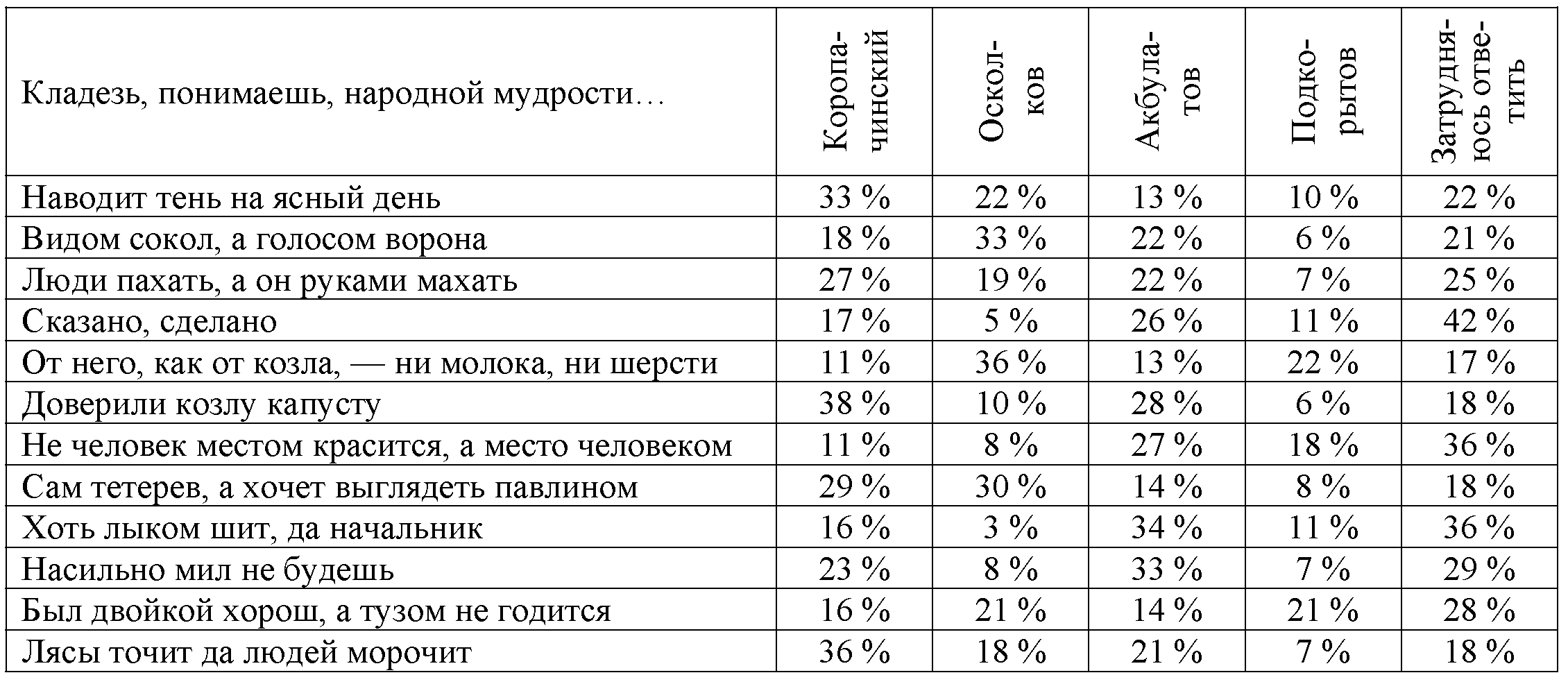 Вторая табличка показывает результаты соотнесения респондентами наших кандидатов с теми или иными пословицами и поговорками.