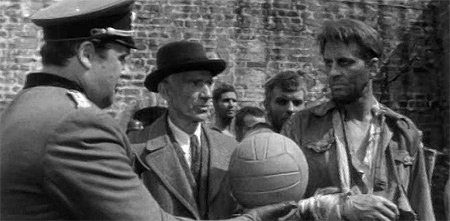 Футбол – это не только адреналин спортивной схватки и экстаз победы, это ещё и потенциальное вместилище совершенно нешуточных драм. Эти два фильма, хотя и сделаны в разное время и в разных странах (первый – в СССР начале 60-х, второй – в США в начале 80-х), объединены одинаковой историей – о команде футболистов в оккупированной Германией стране, которые выходят на поле играть потенциально самоубийственный матч против немцев. В основе обоих фильмов – одна и та же реальная история, о футболистах киевского «Динамо», игравших в футбол в оккупированной фашистами Украине (недавно ставшей поводом для очередного фильма, «Матч» с Сергеем Безруковым); только там, где у советских кинематографистов более-менее выдерживается реализм, у американцев – духоподъемная спортивная картина про триумф духа наперекор всем обстоятельствам. Неудивительно, ведь ставил это дело Джон Хьюстон, мастер воспитательных фильмов о юношестве. Зато в его распоряжении были такие актеры, как Майкл Кейн, Макс фон Сюдов и Сильвестр Сталлоне, а одну из центральных ролей исполнил сам Пеле.