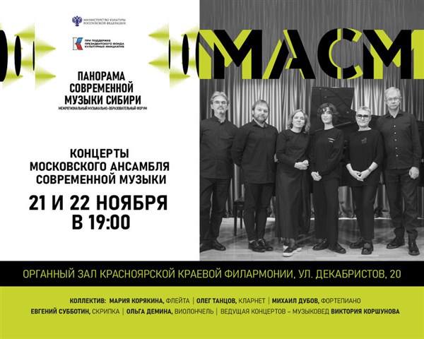 21 и 22 ноября в 19:00 на сцене Органного зала Красноярской филармонии состоится концерт Московского ансамбля современной музыки (МАСМ), который входит в программу Межрегионального музыкально-образовательного форума «Панорама современной музыки Сибири». Проект реализуется при поддержке Президентского фонда культурных инициатив.