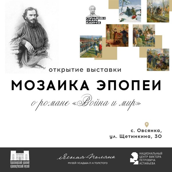 В мемориальном комплексе В.П. Астафьева в Овсянке с 13 сентября до 21 ноября работает выставка «Мозаика эпопеи» из фондов музея-усадьбы «Ясная Поляна». Она посвящена одному из фундаментальных произведений русской классики — роману Льва Николаевича Толстого «Война и мир».