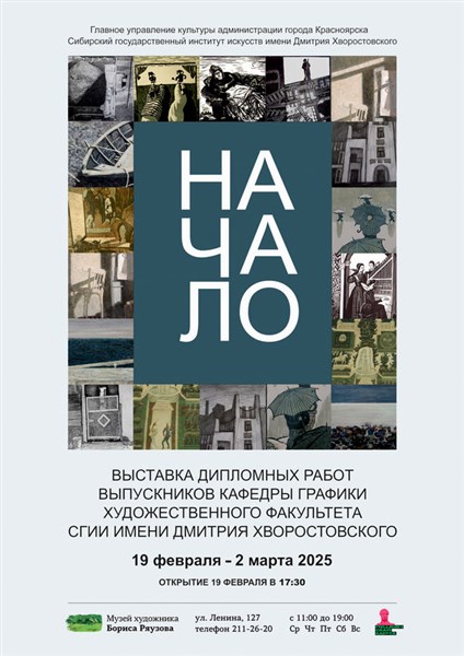 С 19 февраля до 2 марта 2025 года в музее художника Б.Я. Ряузова проходит традиционная весенняя выставка «Начало», которая представляет дипломные работы выпускников прошлого года кафедры «Графика» художественного факультета Сибирского государственного института искусств имени Дмитрия Хворостовского.