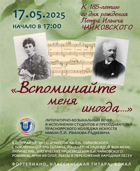 17 мая в 17:00 Красноярский колледж искусств имени П.И. Иванова-Радкевича вновь представит в музее Ряузова камерный литературно-музыкальный вечер к 185-летию со дня рождения великого русского композитора Петра Ильича Чайковского «Вспоминайте меня иногда...»