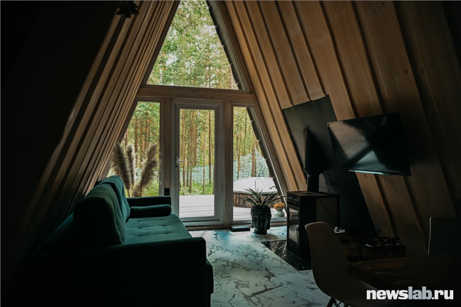 Одно из главных отличий A-frame дома здесь — это интерьер. Стильный, выдержанный и продуманный до мельчайших деталей. Гости окунутся в обстановку из дерева и природного камня. Уютная мебель и приглушенные тона позволят по-настоящему расслабиться и отдохнуть от накопившейся суеты. Вечером можно растопить камин и провести время за неспешной беседой или романтическим ужином.