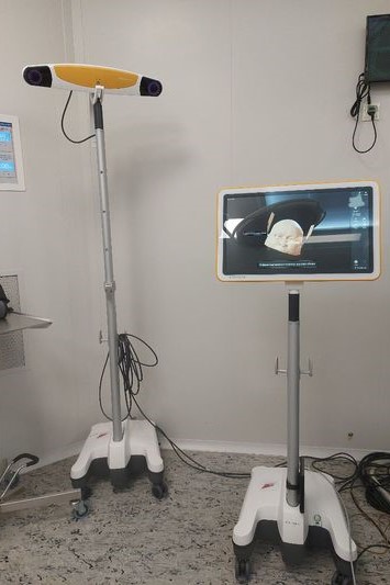 После обработки на экране появляются КТ-снимки и проекция лица пациента. Под «кожей» можно видеть точные очертания опухоли. Это позволяет хирургу выбрать наименее травматичный доступ к ней. С помощью «указки» и маркера на голову пациента наносится контур будущего операционного поля.