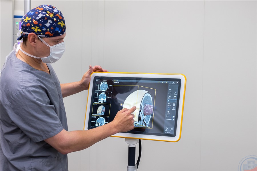 В операционной № 11 готовятся к операции с применением нового оборудования. В систему уже загружены снимки компьютерной томографии пациента. Он поступил в другую больницу города с жалобами, которые заставили врачей провести подробную диагностику. Выяснилось, что в голове мужчины находится опухоль размером с куриное яйцо.