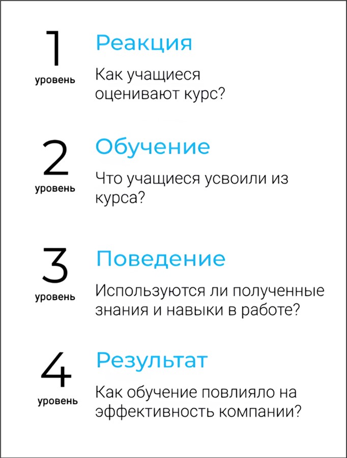 Одна из популярных комплексных методик оценки эффективности обучения персонала – модель Киркпатрика. Она была разработана более полувека назад, но до сих пор популярна. В этой модели используется четыре метрики:
