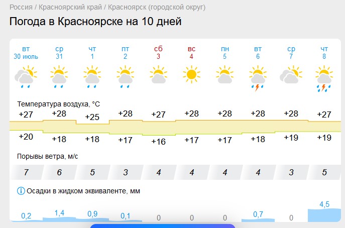 Третья декада будет радовать красноярцев солнечными днями, а также летними дождями при температуре 18... 21 °С.