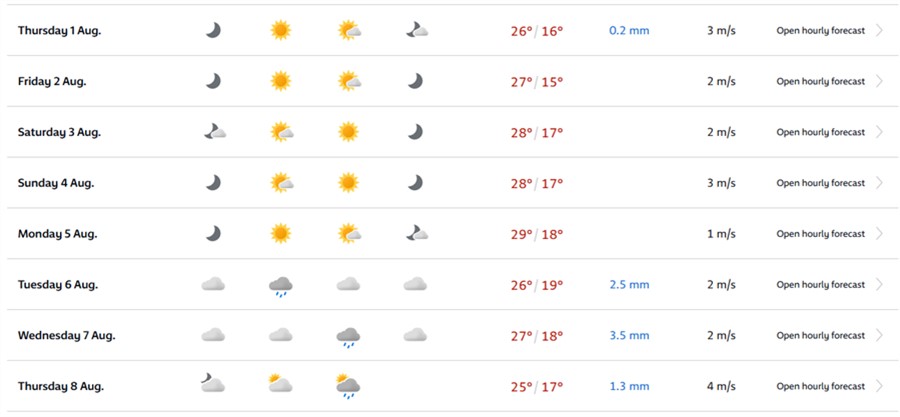 Первая неделя августа, по мнению составителей прогнозов, будет достаточно жаркой — до 28 °С днем и 19 °С ночью. В начале периода синоптики обещают погоду без осадков, но потом начнутся дожди. Температура при этом может понизится до 24 °С днем и 14... 15 °С ночью.