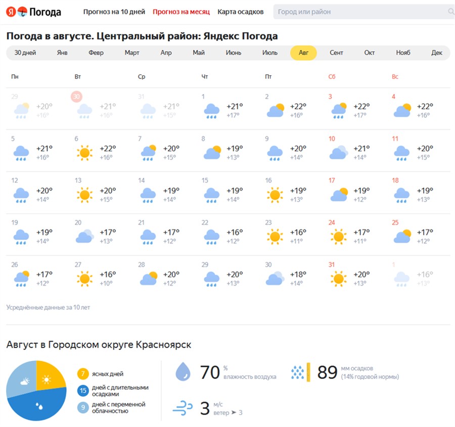 «Яндекс.Погода» обещает 7 ясных и 15 дождливых дней, а также 89 мм осадков, что выше нормы, которая составляет для последнего летнего месяца 76 мм.