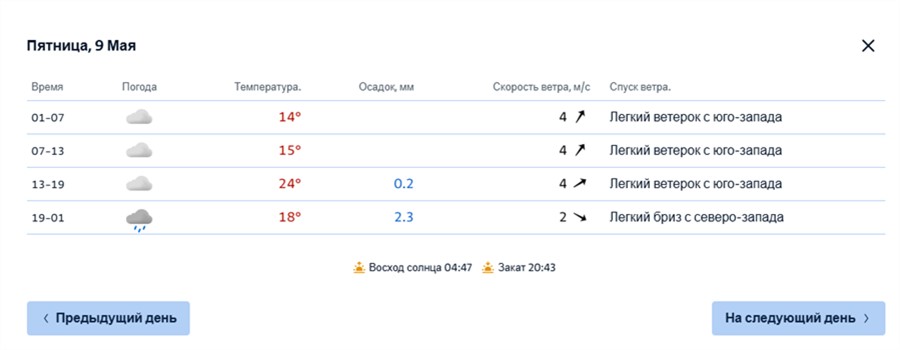 Синоптики обещают, что День Победы будет теплым. Днем столбики термометров покажут до +23 °С, а ближе к вечеру может пойти небольшой дождь и похолодает до +14...+18 °С.