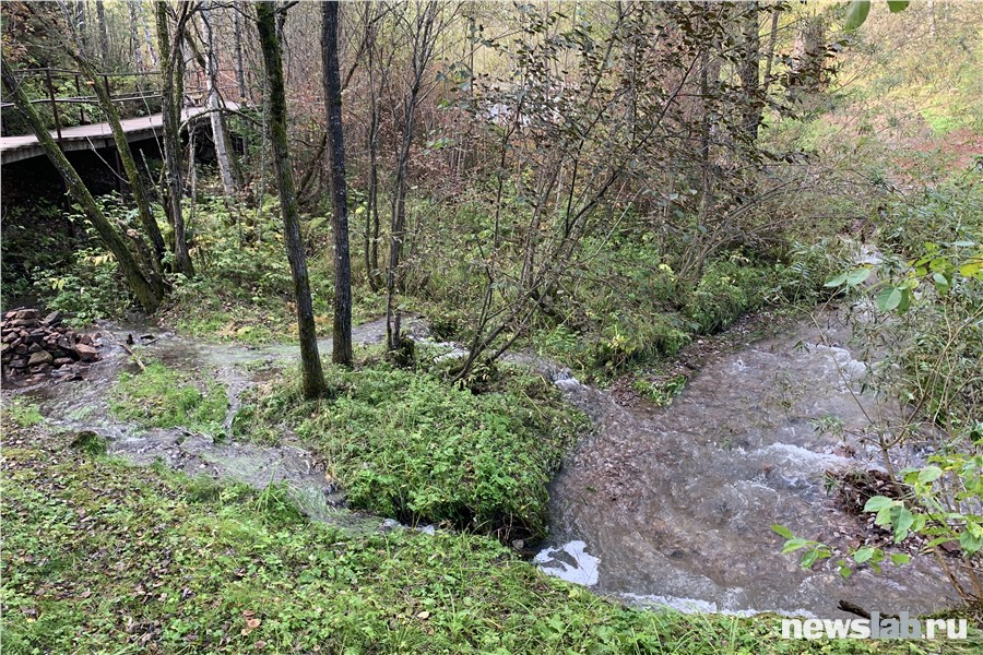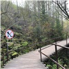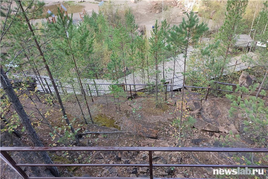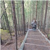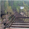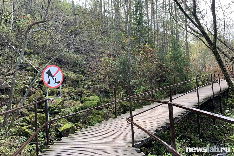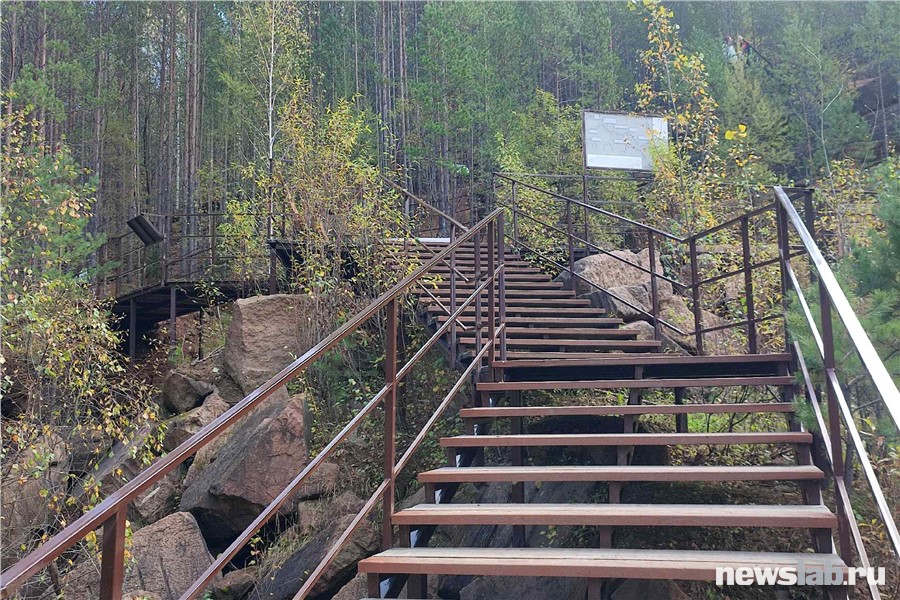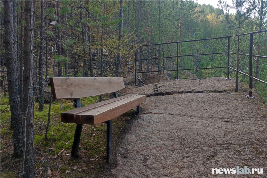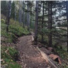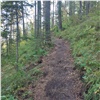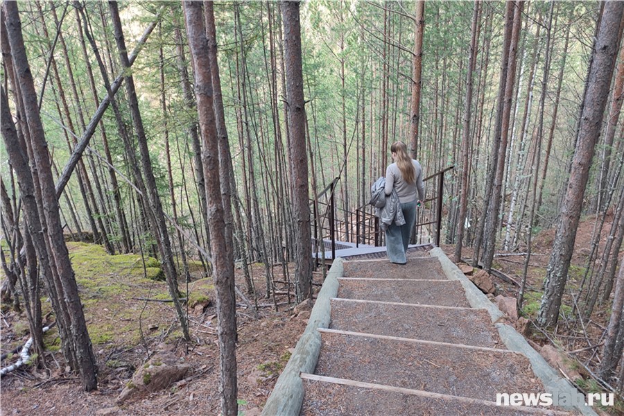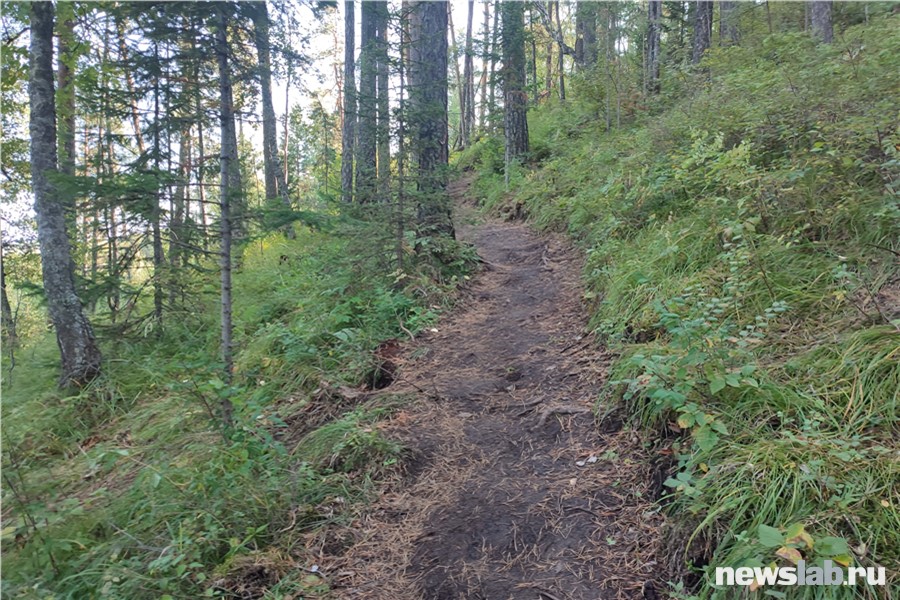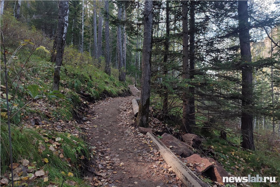 Тропа строилась по новой технологии — ее вырубали в склоне лопатами, потом ставили ограничительные бревна и засыпали получившуюся дорожку мелким гравием. По склону тропка поднимается достаточно полого, первые подъемы от гранитного карьера можно преодолеть по лестницам (куда уж без них).