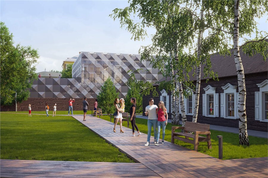 Здание будет трехэтажным (включая подземный этаж) и напомнит тот самый сундук, накрытый ажурной тканью. Эффект «кружева» создадут из перфорированных металлических кассет разного наклона, которые на солнце будут играть, как мазки на палитре. При этом архитекторы продумали важную деталь: верхний этаж немного сдвинут, как крышка сундука, чтобы с территории усадьбы сохранился вид на часовню Параскевы Пятницы.