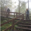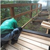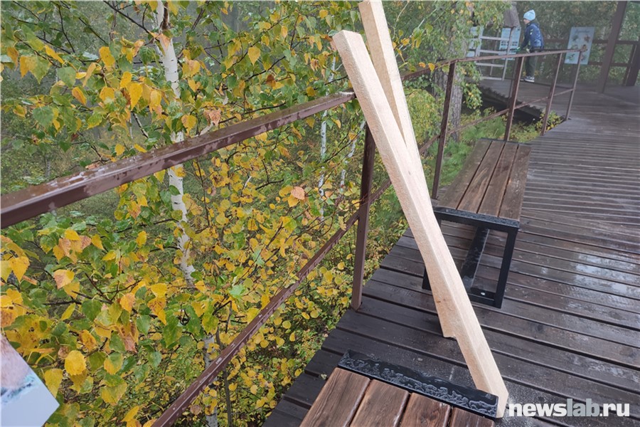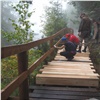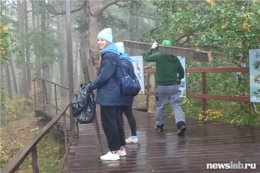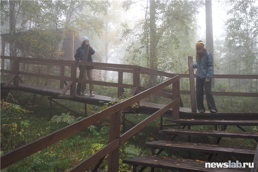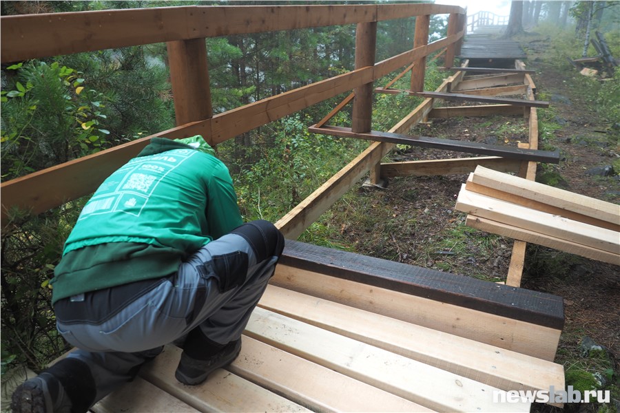 Новые доски к настилу деловито прибивают мужчины. Александр из «Норникеля» признается, что давно ходит на «Столбы» и хочет, чтобы национальный парк был красивым и чистым. Поэтому уже не первый год он принимает участие в экологических акциях компании. В планах — заменить участок сгнившего настила Метров 30-40.