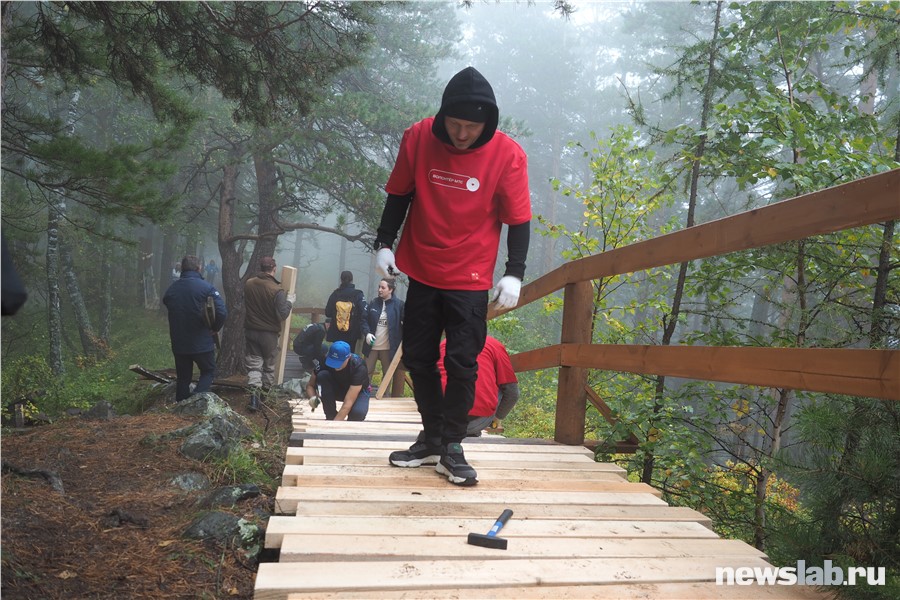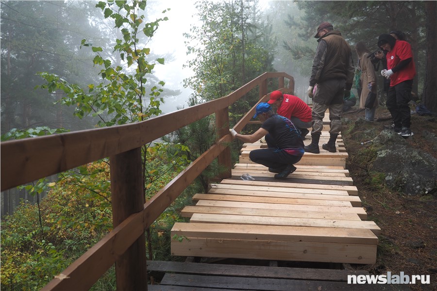 Как обычно, волонтеры распределились на группы. Кто-то занялся транспортировкой строительных материалов, кто-то ремонтировал настилы на тропах, кто-то оттирал надписи со скал.