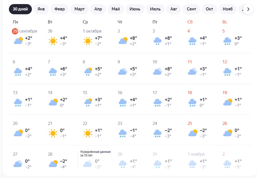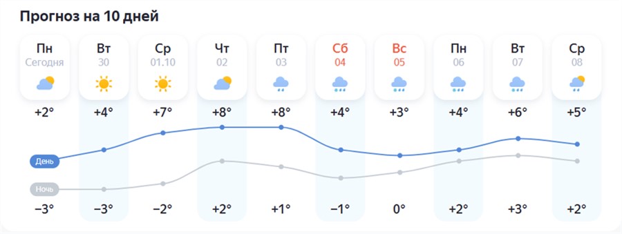 Как показывают «Яндекс.Погода» и gismeteo.ru, почти вся первая неделя октября будет дождливой. Самая высокая дневная температура в этот период — +8 °С, а самая низкая — +3 °С. По ночам термометры будут показывать от −3 до +3 °С.