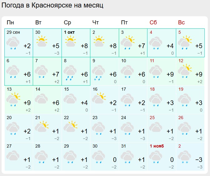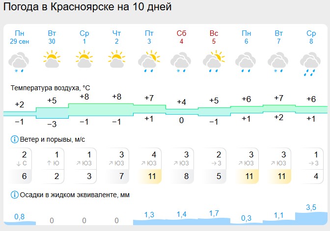 Судя по долгосрочному прогнозу, начиная со второй декады месяца температура днем и ночью опустится к нулю, но дневной «ноль» синоптики обещают красноярцам только в начале 20-х чисел. Дожди и снег в этот период будут идти почти ежедневно.