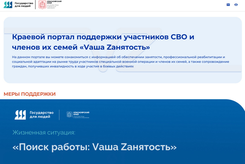 Служба занятости нацелена на постоянное улучшение. Вводятся дополнительные цифровые сервисы, чтобы клиенты могли оперативно получить помощь удобным для себя способом. К примеру, больше узнать о разных мерах поддержки можно на краевом портале «Vаша Zанятость». Он создан агентством труда и занятости населения Красноярского края специально для участников СВО и членов их семей. Портал разработан в рамках федерального проекта «Государство для людей». Инициативу поддержал губернатор Красноярского края Михаил Котюков.