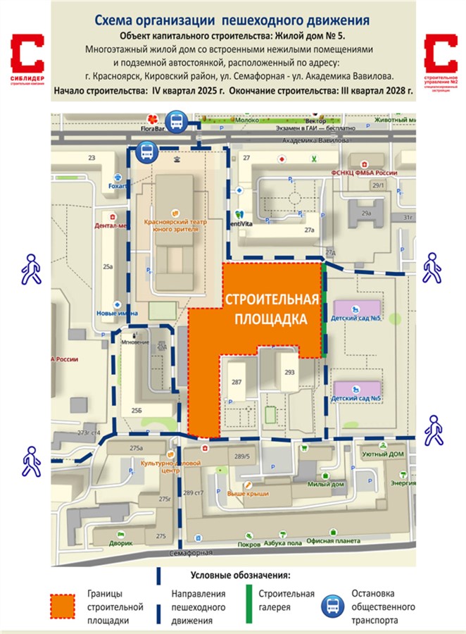 Чтобы обеспечить безопасное проведение работ, сквозной проезд от Театра юного зрителя на Семафорную временно перекроют. Доступ сохранят только для подъезда к детскому саду № 5. Парковку для жителей перенесут ближе к улице Семафорной, а детско-спортивную площадку переместят к дому по адресу Вавилова, 35.