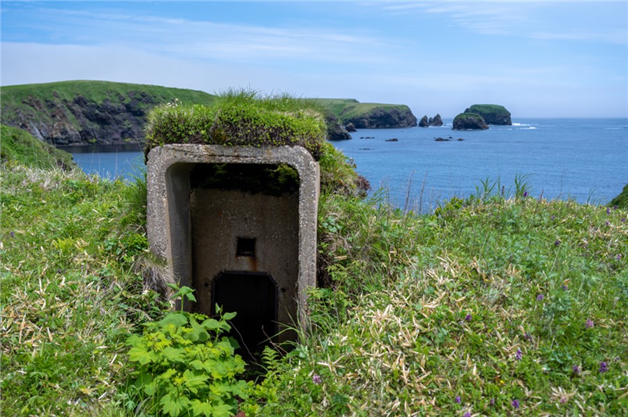 Маячная не просто живописна, но и идеальна для базового лагеря, здесь есть ручей, удобные полянки с ветрозащитой, по скалам для удобства провешены канаты. Из завесы тумана то и дело выплывают островки, а из кустов — японские огневые точки. Японские, потому что как не старайся, с головой в нужном положении не входишь, 165 см, видимо, предельный рост стрелка для данной позиции. Плюс бухты — близость леса, на деревья можно повесить пластиковые бидоны с продуктами, а потом наблюдать, как лисы пытаются до них добраться. Из других развлечений — прогулки к Робинзону и к локациям, описанным ниже, купание в Тихом океане, битвы с чайками за колбасу, любование прибоем и рассветом.