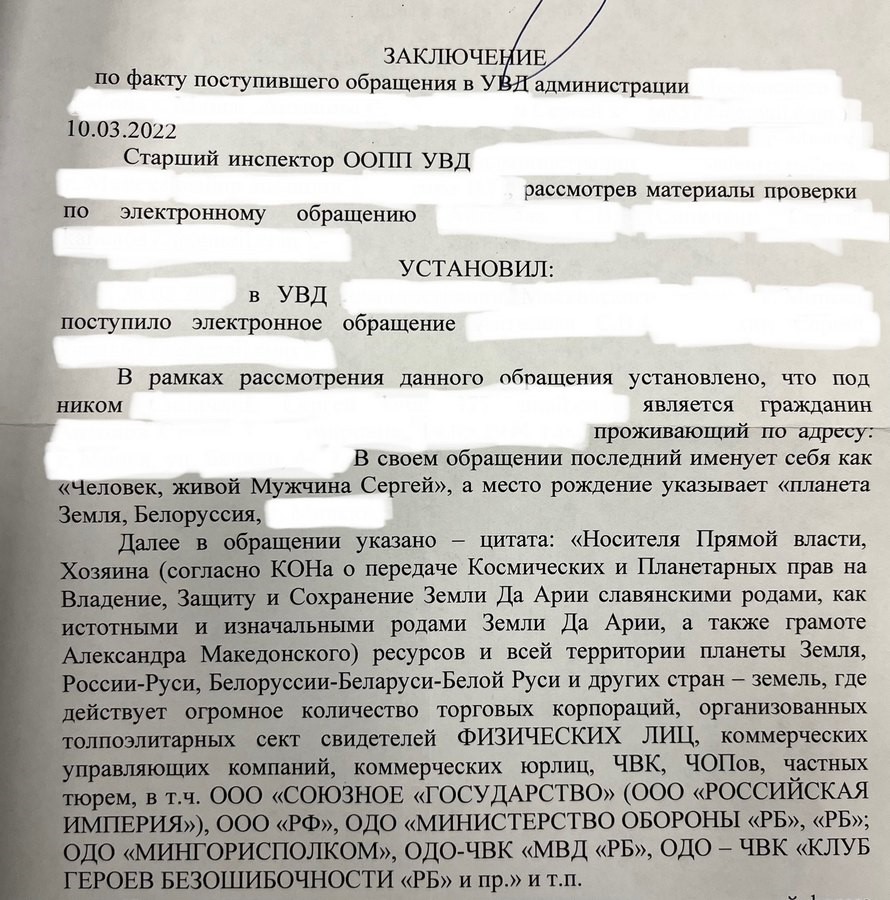 «Ответчик приобщила к материалам дела ксерокопию уведомления, «выданного ВОЗ», в котором указано, что «все физлица, которые называют себя гражданами Российской Федерации, либо считают себя таковыми, в соответствии с МКБ-10, F20-F29 Всемирной организации здравоохранения официально признаются подверженными хроническому психическому расстройству и представляют потенциальную опасность для окружающих, что влечет за собой правовые последствия в виде признания их недееспособными», — рассказали в объединенной пресс-службе судов Красноярского края.