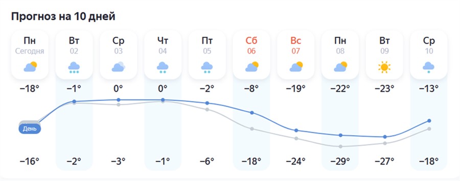 К выходным температура начнет опускаться до отметок, более подходящих для зимы. Gismeteo.ru обещает к концу первой декады −25...-28 °С по ночам, которые из-за ветра и влажности будут ощущаться на все −35 °С.