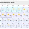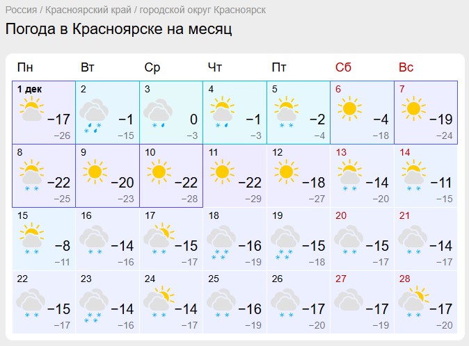 Норма среднемесячной температуры декабря в Красноярске −13,2 °С, а норма осадков — 31 мм. Судя по прогнозам, начнется месяц с недели тепла. После морозных выходных столбики термометров снова поднимутся до отметки в 0... −2°С градусов. Почти каждый день с понедельника до пятницы синоптики обещают снег. Портить картину будет только ветер, порывы которого будут достигать скорости в 10-11 метров в секунду.