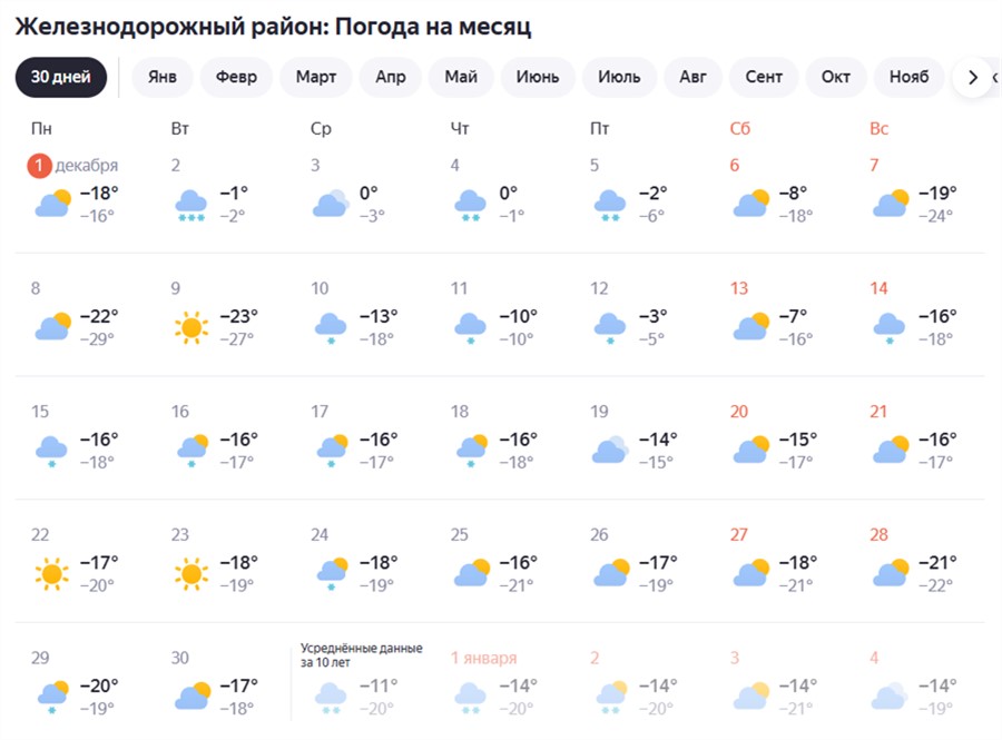 Судя по долгосрочному прогнозу, самым холодным периодом месяца будет конец первой и начало второй декады. По ночам столбики термометров будут показывать до −29 °С, а днем будет −20...-22 °С.