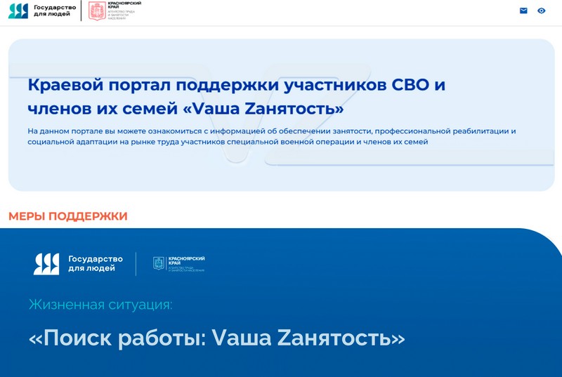 В крае действует портал «Vаша Zанятость», инициативу создания которого поддержал губернатор Михаил Котюков. Ресурс запущен в рамках федерального проекта «Государство для людей». Здесь можно узнать о разных мерах поддержки, в том числе о резервировании рабочих мест для трудоустройства участников СВО на предприятиях Красноярского края.