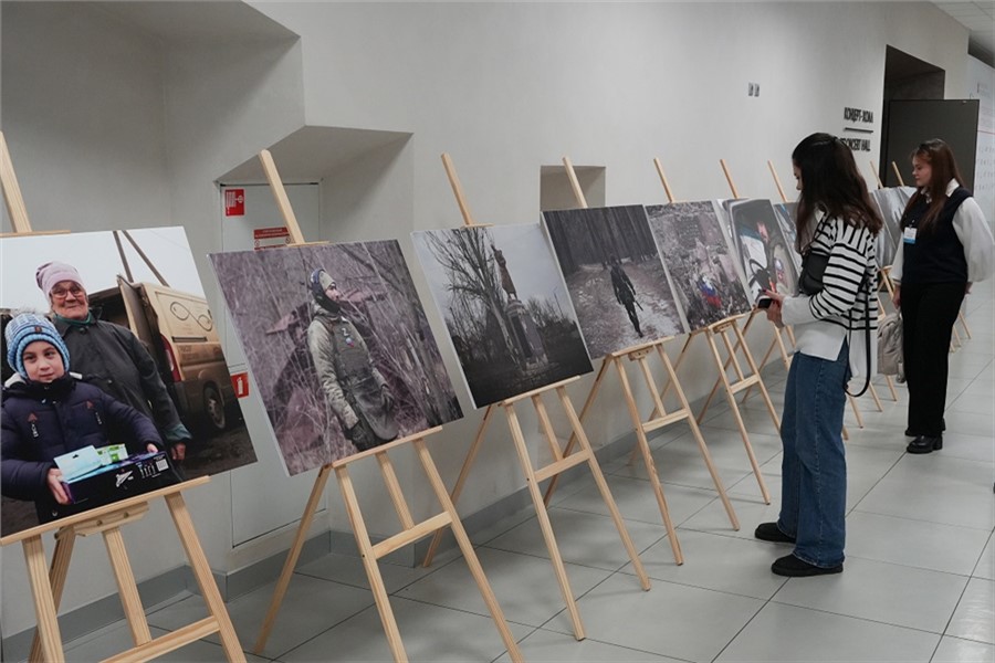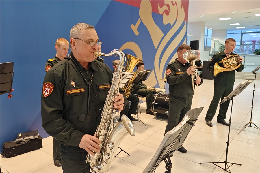 Перед пленарным заседанием в коридорах конгресс-холла звучали марши в исполнении Сводного военного оркестра Красноярского соединения войск национальной гвардии РФ, а гости форума могли ознакомиться с фотовыставкой красноярских артистов «Донбасс — соль земли русской».