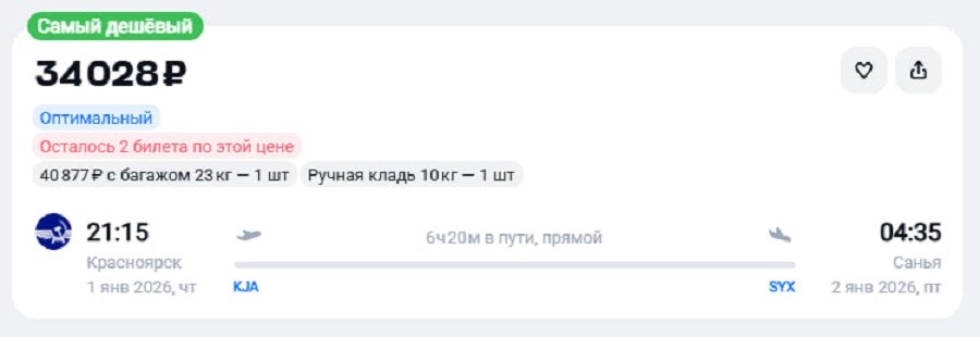 Она рекомендовала жителям Красноярска и края заранее определиться с направлением для путешествия и озадачиться покупкой билетов. Если верить прогнозу специалиста, уже 25 декабря цены на авиабилеты вырастут в два раза.