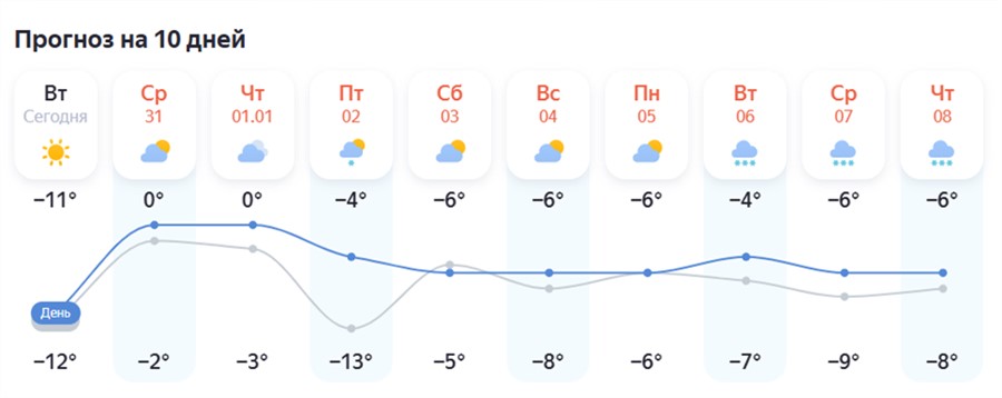 До конца первой декады «Яндекс.Погода» обещает в районе −6 °С днем и −7...-9 °С по ночам. Gismeteo обещает температуру чуть ниже — −9...-12 °С ночью и от −1 °С до −7 °С днем.