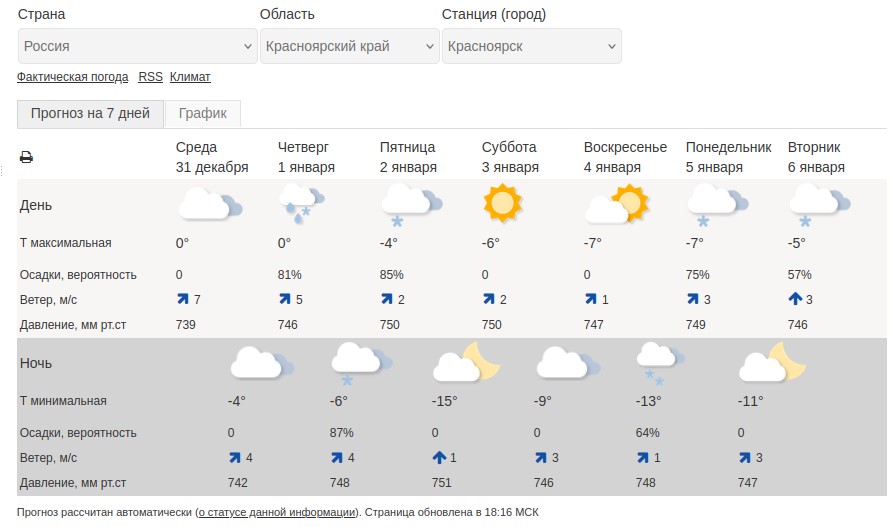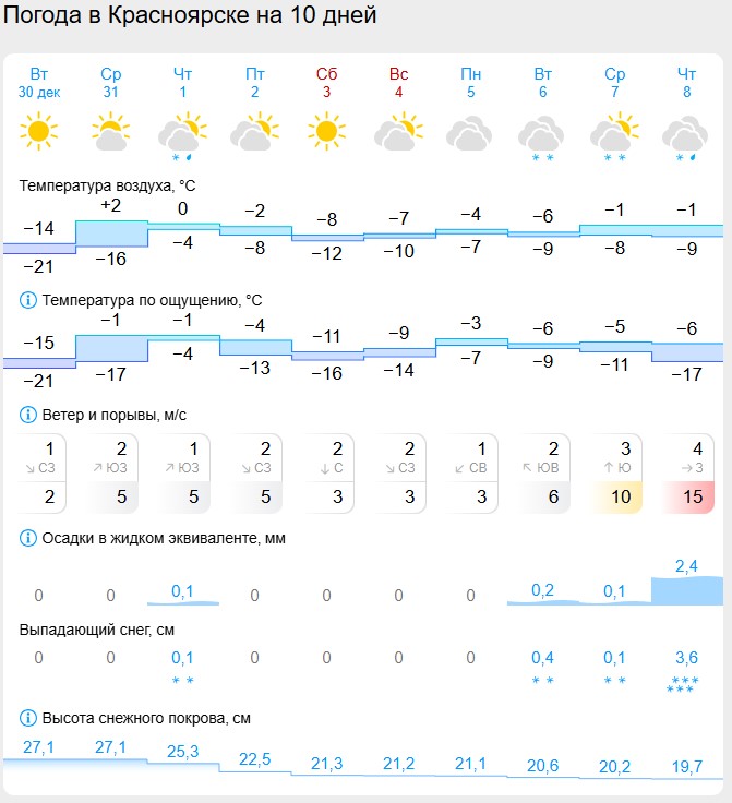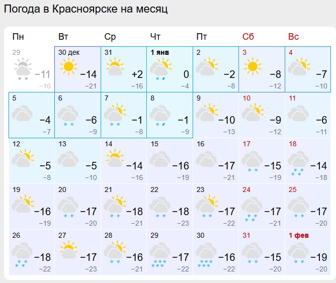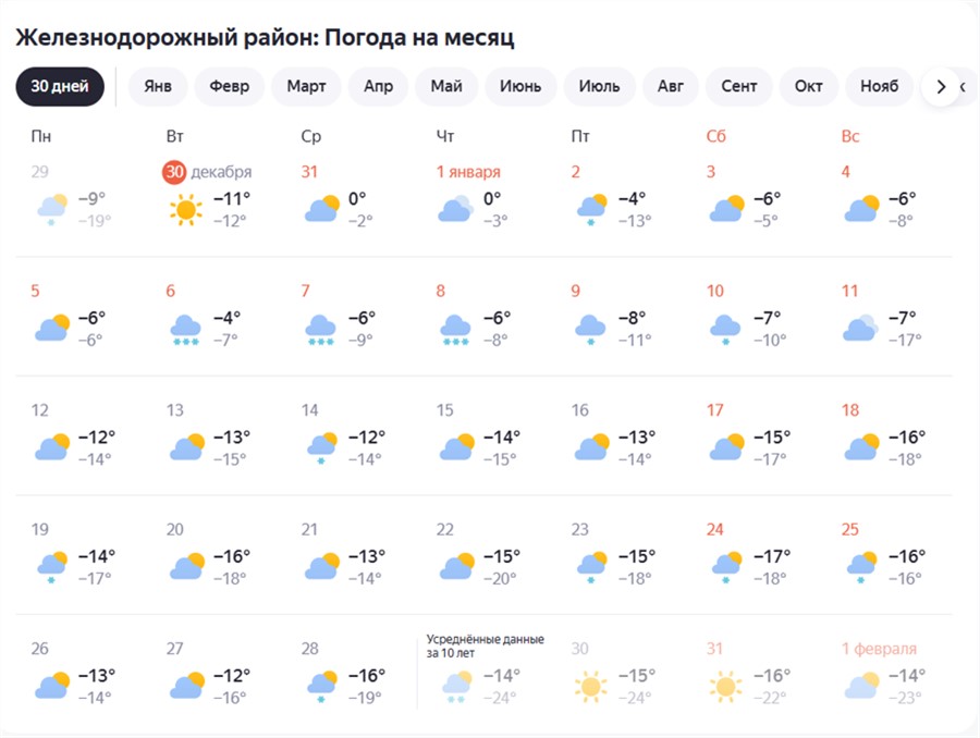 По норме январь должен быть чуть холоднее, в районе -15°С, а осадков, наоборот, обычно выпадает чуть меньше, чем в декабре — 17 мм. Давайте посмотрим, что именно нам обещают синоптики.
