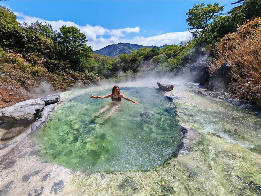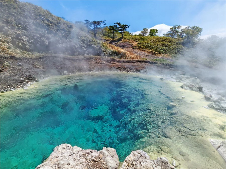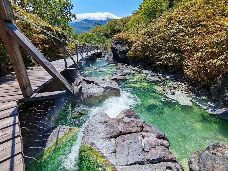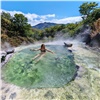Говорят, что «Кипящая река» — самые красивые термальные источники на Дальнем Востоке. Со склона вулкана каскадом стекает бурлящий поток ярких, даже кислотных, цветов. В естественных ваннах, промытых водой в скале в нижней части реки, вода остывает с 50 до 35ºС. Там, в окружении диковинных растений и мелких ручейков можно и понежиться. На источниках также есть искусственные ванны и экотропа наверх к кипящему озеру, где туристы традиционно варят яйца и любуются видами.