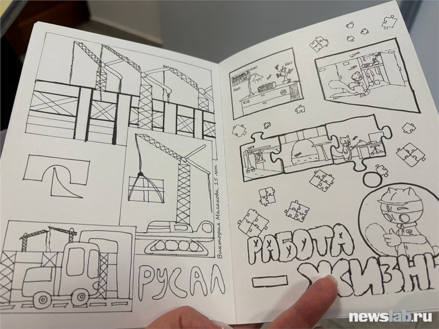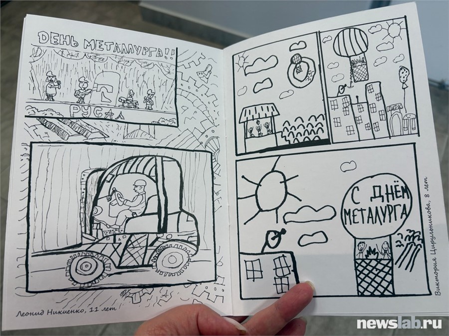 Юная художница Вика создала целую страницу рисунков. Говорит, получилось не сразу: «Когда мы пришли сюда, сначала мы все познакомились, и нам на телевизоре показывали картинки работы. На сам завод нас пока не водили, сегодня только поедем. Потом мы начали маленько рисовать и с каждым занятием делали это все лучше и лучше».