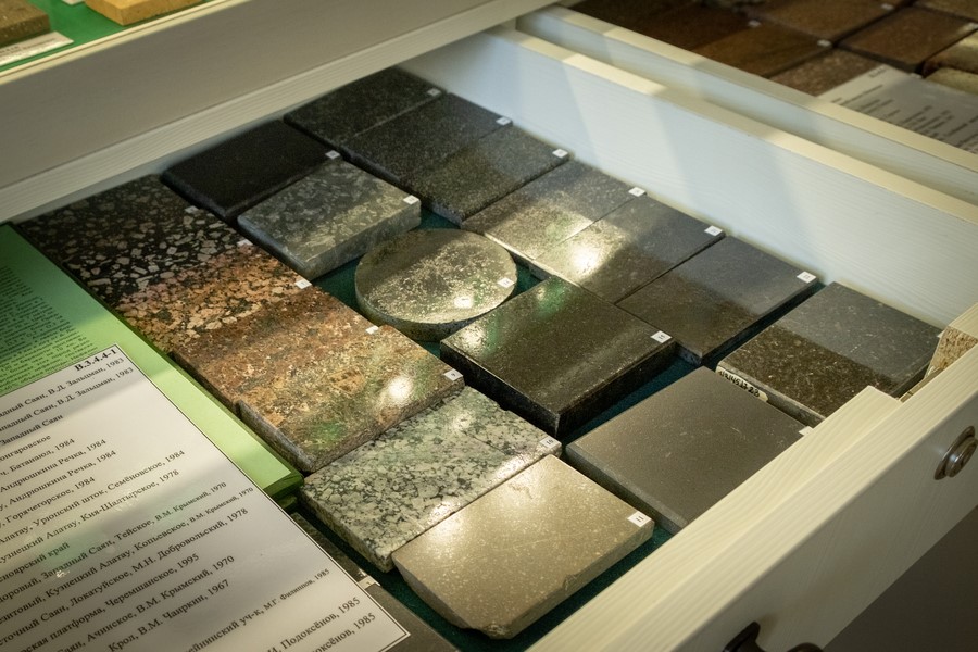 «Коллекция облицовочного камня включает 966 образцов, многие из которых собирались ещё в 1960–1980-е годы и ранее не демонстрировались в полном объёме. Это не просто красивая коллекция. Это рабочий, учебный материал для геологов, студентов, архитекторов и строителей. Все образцы в экспозиции имеют полировку, поэтому хорошо видны различия между низко- и высокодекоративными породами», — отметила Татьяна Юрьева.