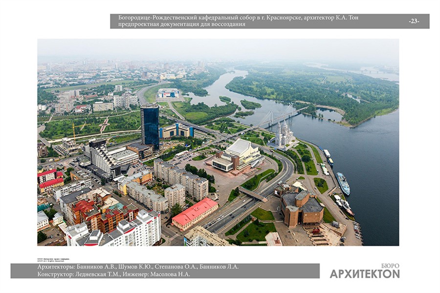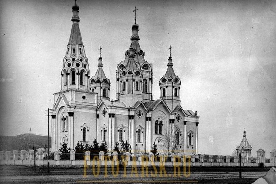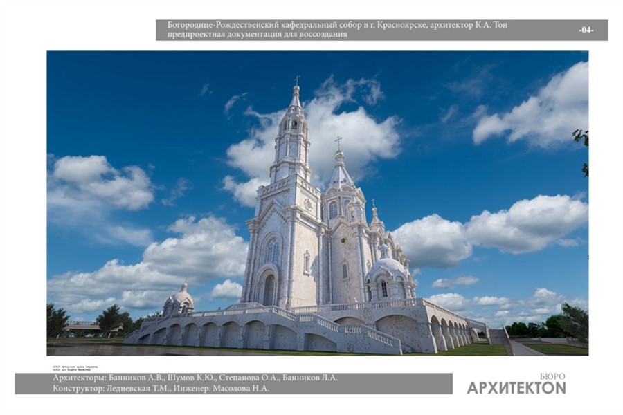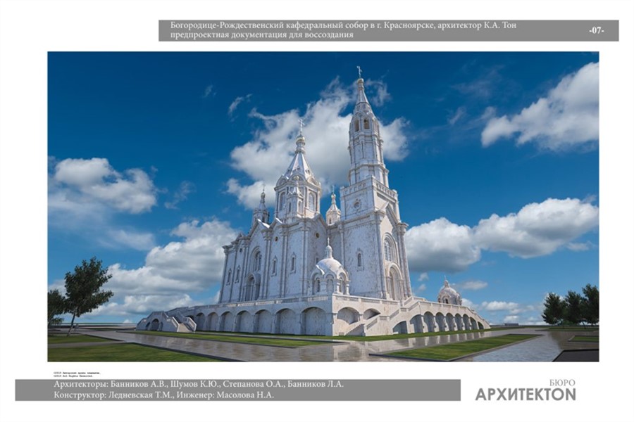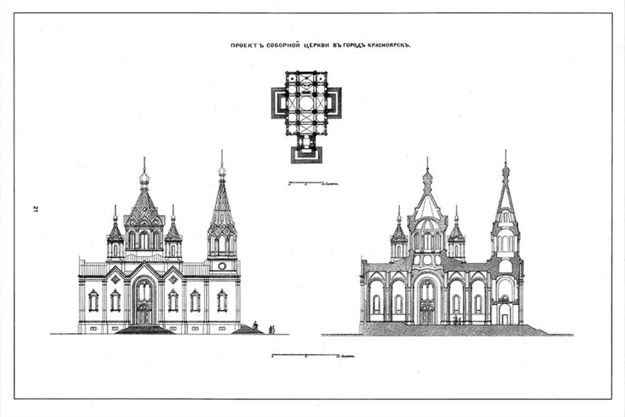 Мелочная торговля, взорванный храм и наследие революцииТомская духовная консистория, рассмотрев ходатайство купца, ссылаясь на Указ Святейшего Синода выдвинула требование — храм строить по проекту архитектора Константина Андреевича Тона, причем проект должен был получить Высочайшее утверждение. Архитектор предложил «русско-византийский стиль», начало которому положила Благовещенская церковь Конногвардейского полка в Санкт-Петербурге (ныне утрачена). Собор в Красноярске эксперты называют оригинальным сооружением, а не типовым, как проекты для некоторых других провинциальных городов.