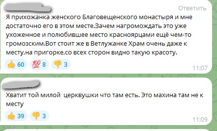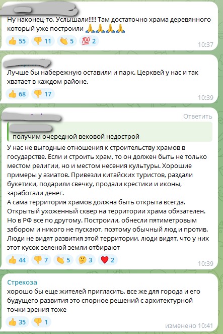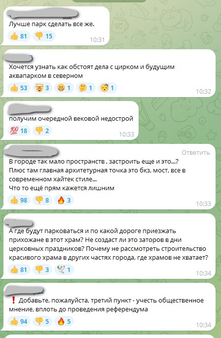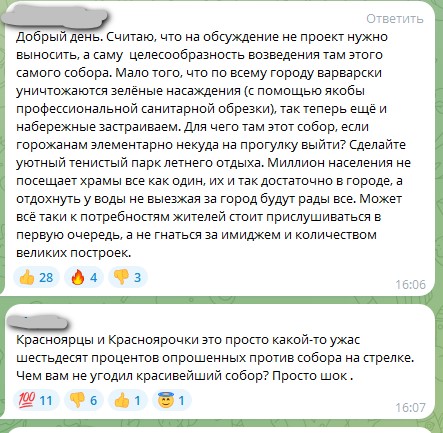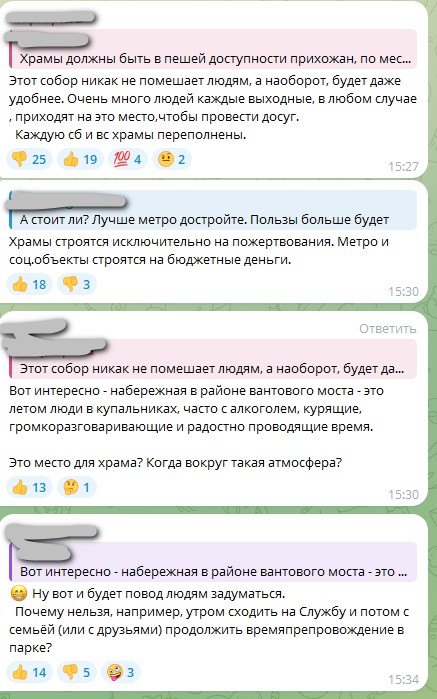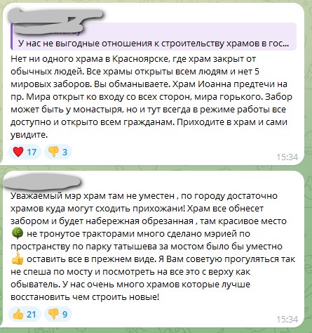 Предложение об обсуждении с воодушевлением встретили красноярцы. Под постом они оставили больше 700 комментариев. В них многие писали, что не хотят, чтобы храм строили именно на Стрелке и предлагали вынести вопрос на голосование: «В прошлом году голосовали за благоустройства пространств в Красноярске с подтверждением личности через госуслуги. Почему бы не повторить этот опыт с повторным обсуждением храма на Стрелке? Это эффективней и показательней, чем публичные обсуждения среди рабочего дня. На которые могут придти не все, кто хотел бы там присутствовать».