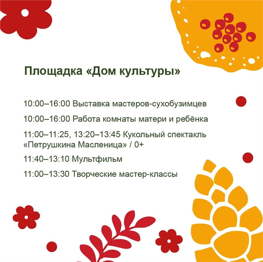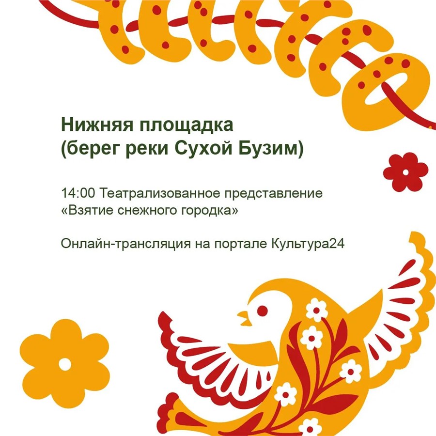 Масштабное и очень красивое празднование проводов зимы запланировано в Сухобузимском. Праздник пройдет на нескольких площадках с 11 до 16 часов. Полную программу мероприятий можно посмотреть в карточках от регионального минкульта.