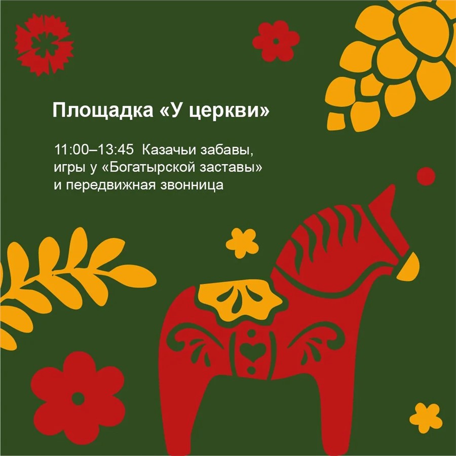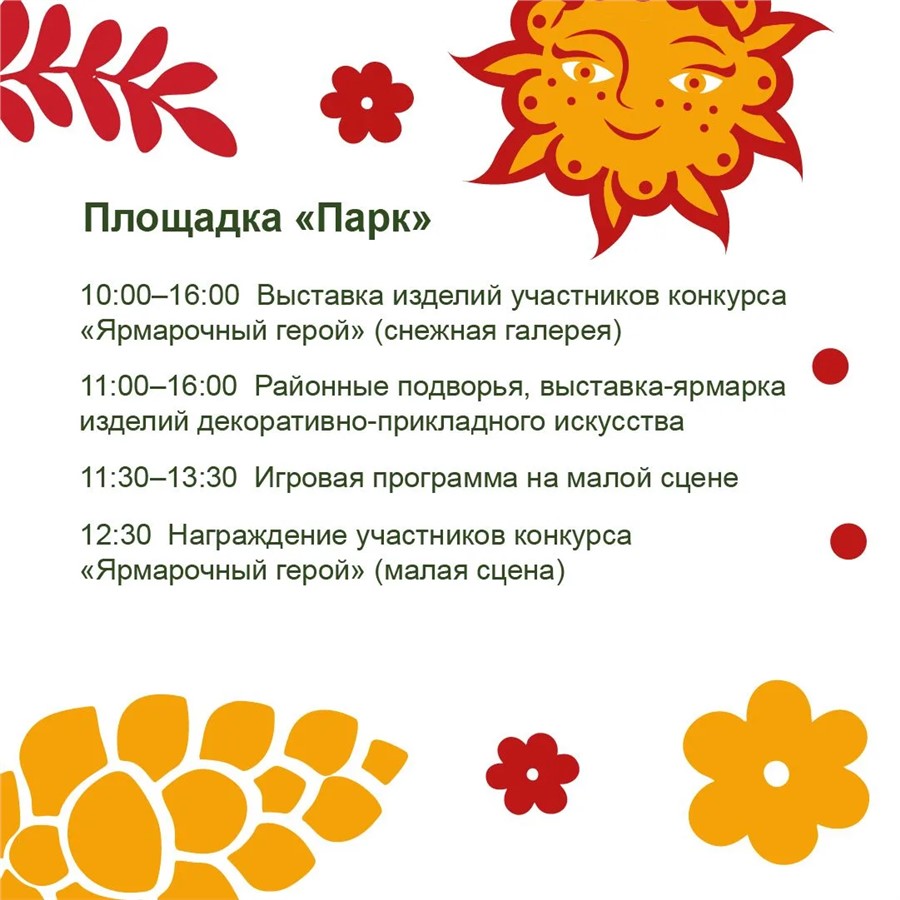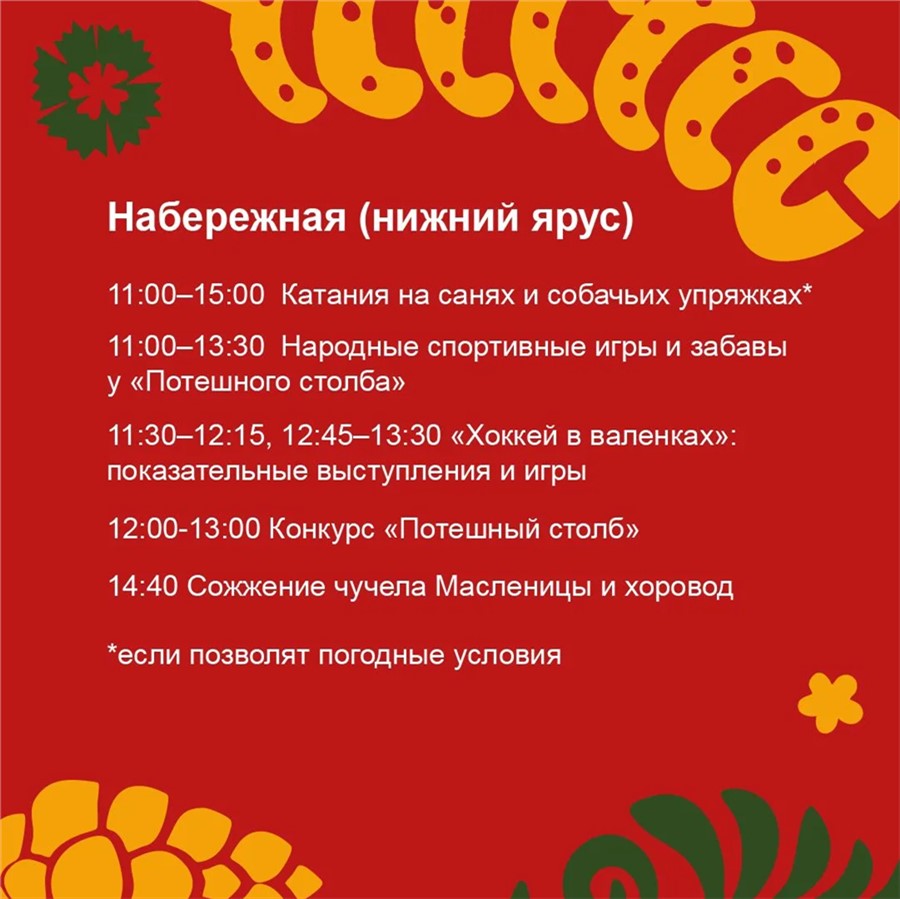 В 10:00 заработают торговые ряды с угощениями. Гостей ждут традиционные масленичные забавы: перетягивание каната, метание валенка, бег в мешках и оригинальный боулинг с матрёшками. Завершится первая половина праздника концертом.
