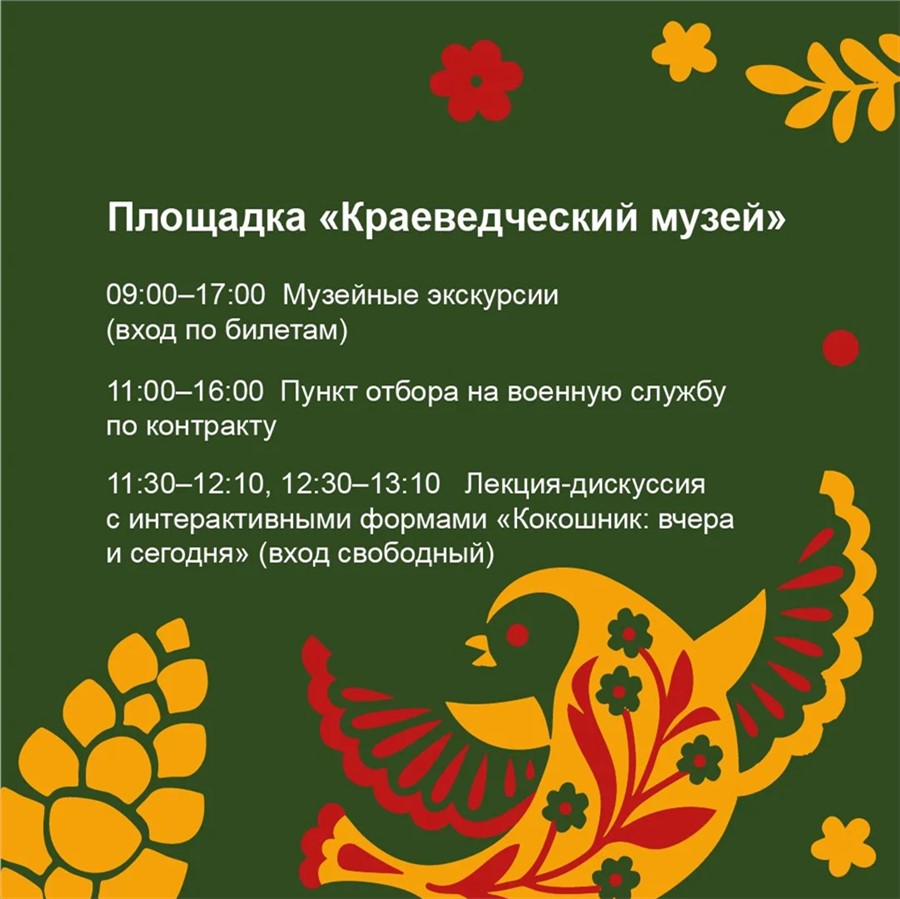 «Тема этого года — „Магия мужского труда“. На интерактивных театрализованных площадках будут представлены охотничий и рыболовный промыслы, гончарное, бондарное и сапожное ремесло, плотницкое дело, изготовление саней, упряжи и основное занятие крестьян — земледелие. Акцент традиционно сделан на обычаях и обрядах. Будут открыты экспозиционные объекты, выставки, музейные мастерские. Оборудованные фотозоны позволят сделать яркие красивые фотоснимки. Ярмарка ремесел предложит покупателям самый разнообразный товар от народных умельцев. Сибирская кухня не оставит без румяных блинов и горячего чая», — обещают работники музея.
