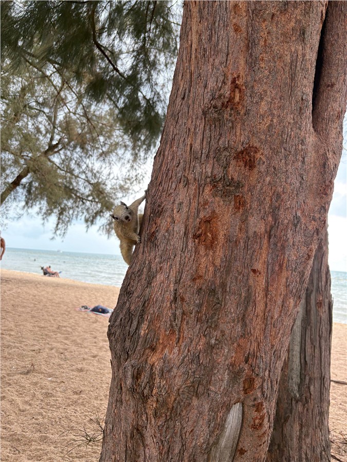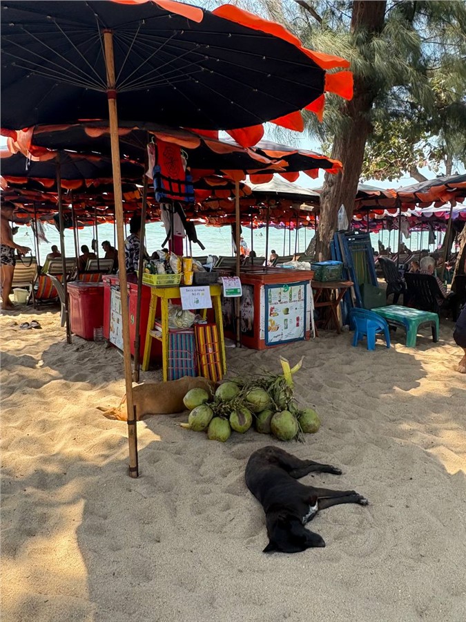 Пляж в районе Джомтьена — чистейший, хотя вода здесь не бирюзовая. Но мутноватость дает не грязь, а песок. Плюс этого места в том, что вдоль берега растут хвойные деревья. Это позволяет экономить на лежаке и зонте — расстелил циновку в тени, а сверху еще и белки скачут. Их можно покормить, но осторожно — характер у хвостатых еще тот.