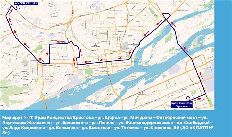 Маршрут № 4: Храм Рождества Христова — ул. Щорса — ул. Мичурина — Октябрьский мост — ул. Партизана Железняка — ул. Белинского — ул. Ленина — ул. Железнодорожников — пр. Свободный — ул. Ладо Кецховели — ул. Копылова — ул. Высотная — ул. Тотмина — ул. Калинина, 84 (АО «КПАТП № 5»)