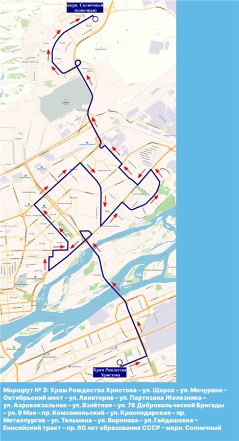 Маршрут № 3: Храм Рождества Христова — ул. Щорса — ул. Мичурина — Октябрьский мост — ул. Авиаторов — ул. Партизана Железняка — ул. Аэровокзальная — ул. Взлётная — ул. 78 Добровольческой Бригады — ул. 9 Мая — пр. Комсомольский — ул. Краснодарская — пр. Металлургов — ул. Тельмана — ул. Воронова — ул. Гайдашовка — Енисейский тракт — пр. 60 лет образования СССР — мкрн. Солнечный